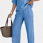 Sættet forener håndværkets omhyggelige detaljer med materialer af høj kvalitet: et let linnelignende stof og forhøjede blomsterbroderier, der giver det to-delte ensemble en menneskelig finesse. Den rummelige bluse med nedhængende ærmer sikrer daglig komfort, mens blomsterbroderierne tilfører struktur og diskret luksus. Den kølige Terylene-blanding giver bevægelsesfrihed og holdbarhed, mens buksernes brede elastiske talje sikrer en afslappet, sofistikeret pasform. Begrænset udgivelse i kollektionen signalerer provenance og omtanke og gør Lenny | Boho sæt til en tidløs investering og et samtaleemne for dem, der værdsætter kvalitet frem for kortvarige trends.