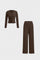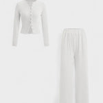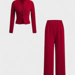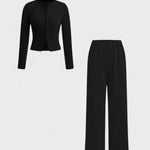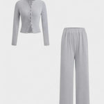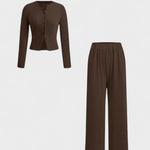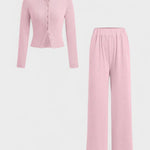 Oplev en elegant look med Thea – et to-delt sæt med langærmet top og bukser.