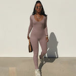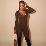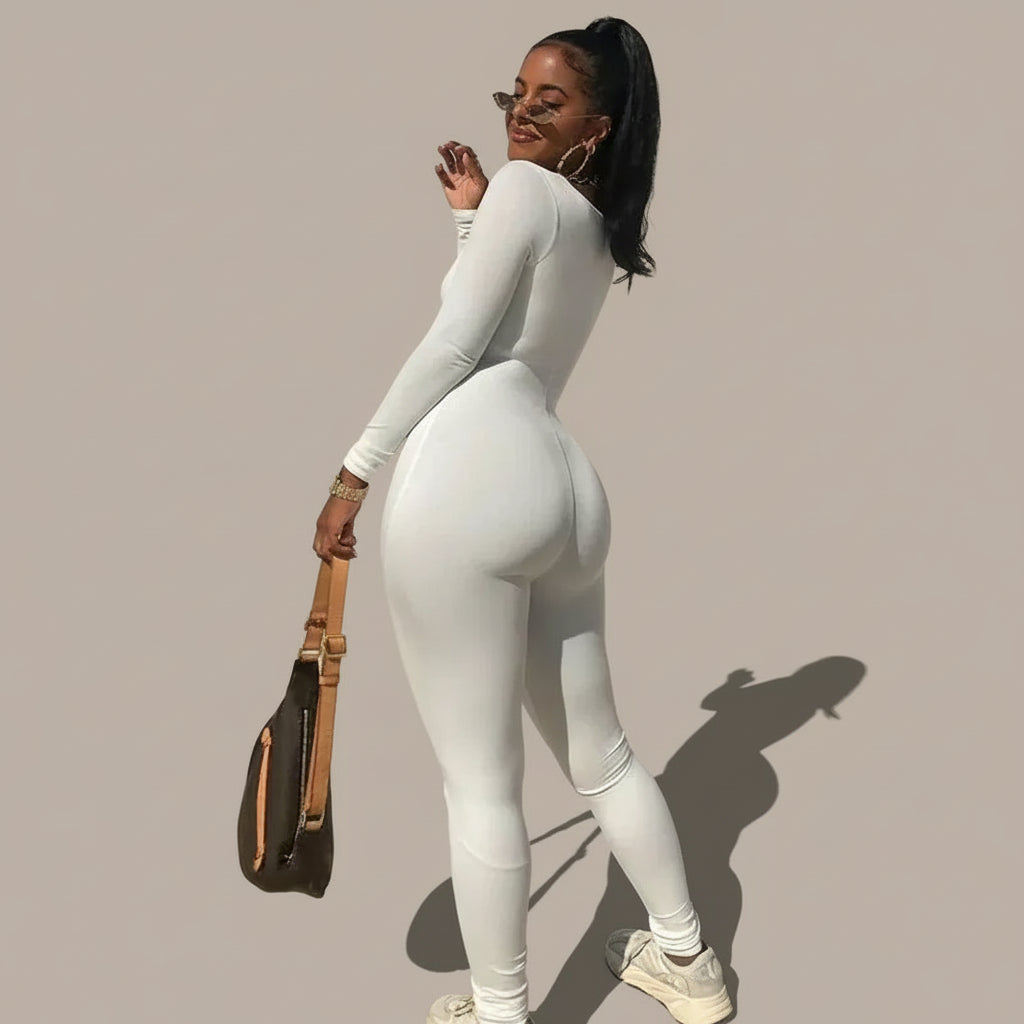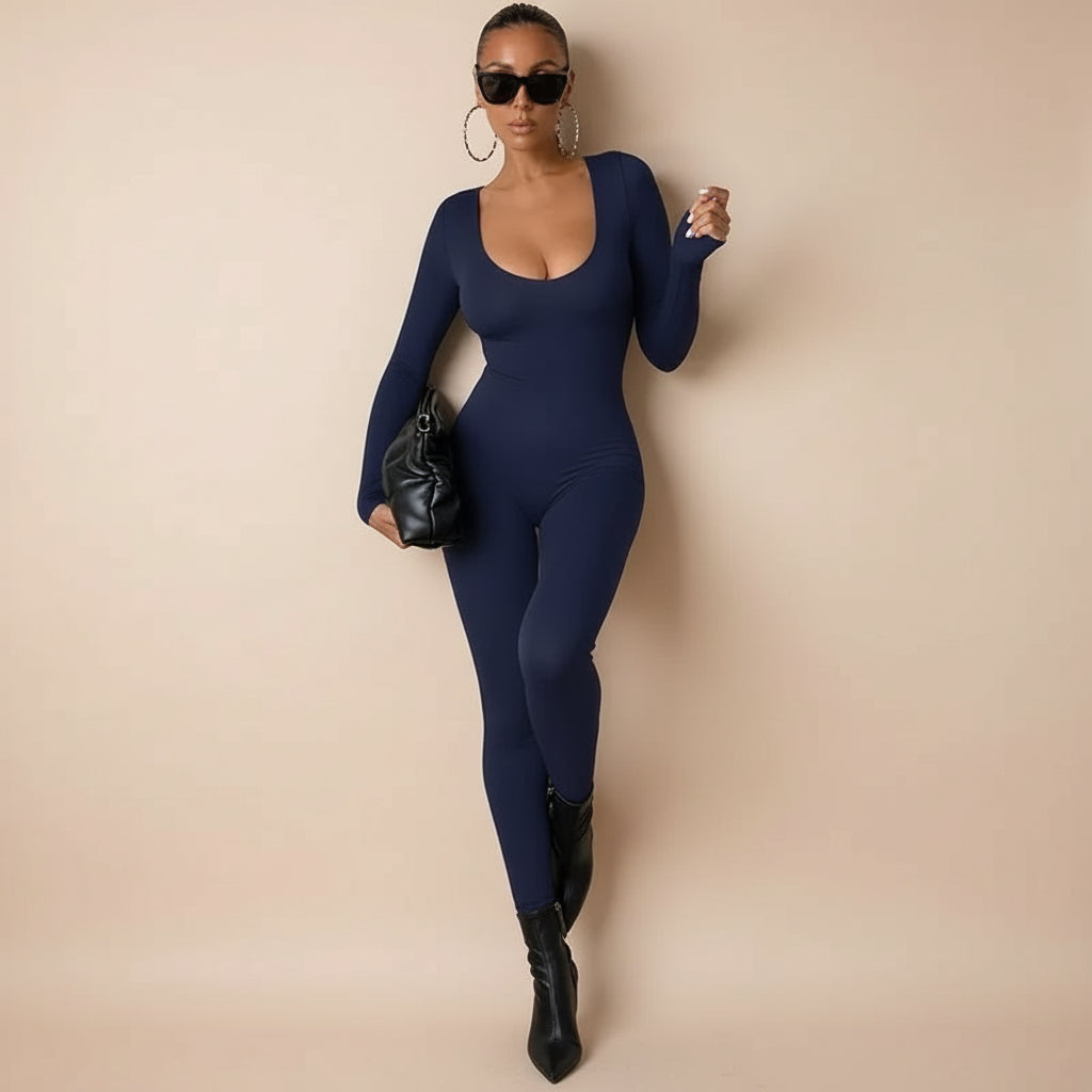 Vi præsenterer den langærmede Bodycon-jumpsuit til efterår og vinter, et must-have for alle, der søger stil og komfort i de koldere sæsoner.