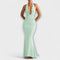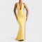 Den er designet til at omfavne hver eneste kurve og er fremstillet af mat jersey af høj kvalitet med et strejf af stretch for ekstra komfort. Den har en dyb U-formet udskæring, der er forstærket med bøjle, og en justerbar halsudskæring. Den er forfinet med perfekt placerede sømme i siderne og på ryggen og afsluttes med en fishtail-silhuet med en smuk slæb.