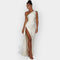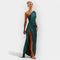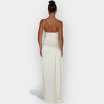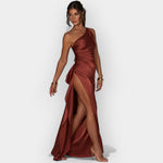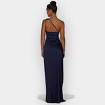 Denne kjole udstråler diskret luksus med sit glatte satinstof og elegante silhuet.