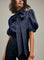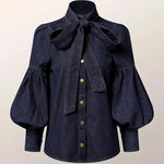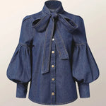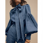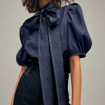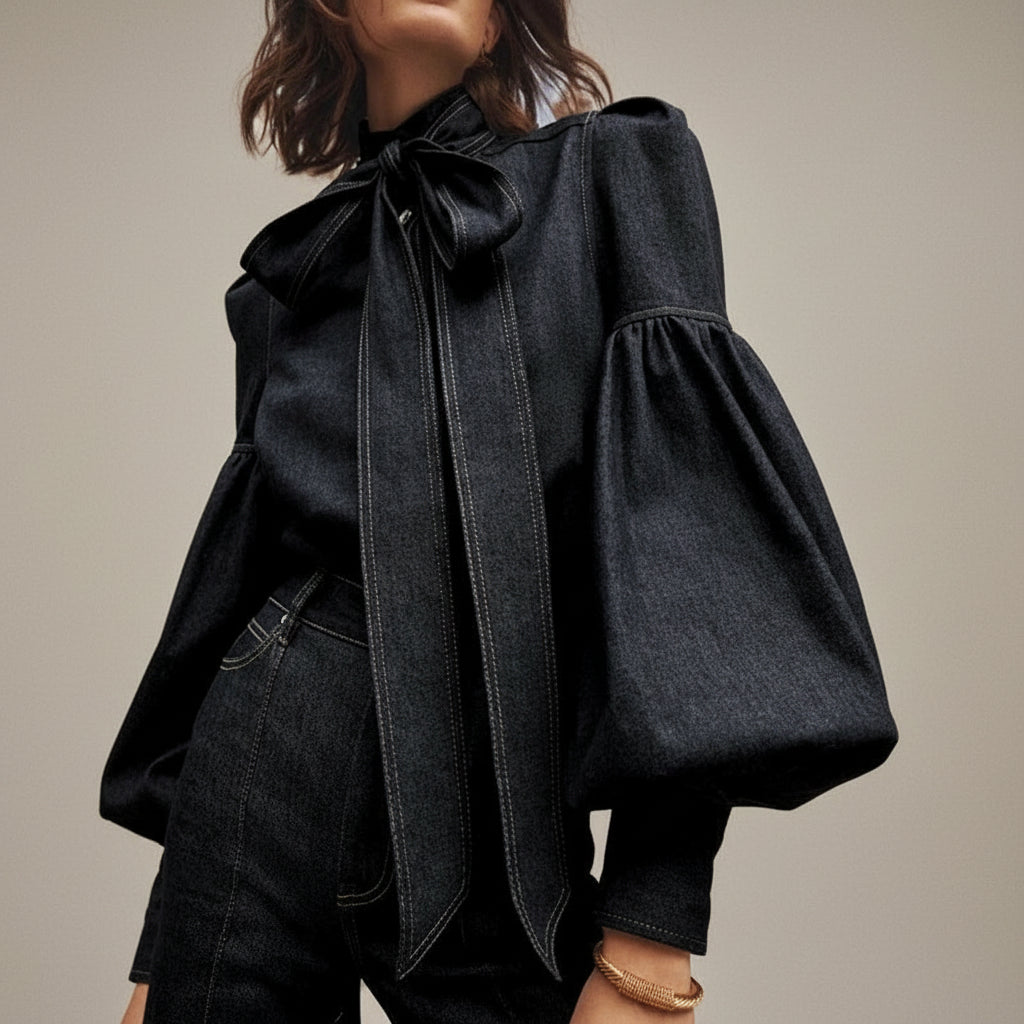 Med et moderne og elegant design skiller denne skjorte sig ud med sine lange, puffede ærmer, der giver et sofistikeret touch, mens detaljen med sløjfen ved halsen tilføjer ekstra charme.