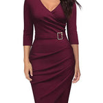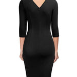 Med lange ærmer og en sofistikeret V-udskæring er denne kjole det perfekte valg til arbejdspladsen eller sociale begivenheder. Den slanke pasform fremhæver den feminine silhuet og giver et look, der kombinerer komfort og klasse, ideelt til den moderne kvinde.